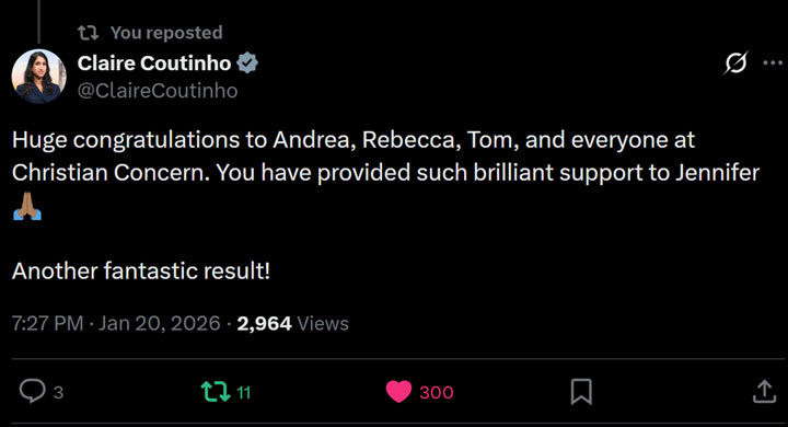 This latest hearing follows the cancellation of a previous internal disciplinary hearing in December 2025, at which Jennifer could have been dismissed. That hearing was withdrawn following political intervention, including a public statement and letter from Claire Coutinho MP, warning that taking action against Jennifer would be a “grave injustice.”